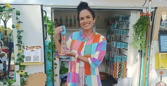 A artesã Angélica Cristina, proprietária da Kombiju, transformou a paixão pelo artesanato em negócio. Desde 2018, quando deixou o emprego formal e investiu numa Kombi transformada em loja móvel, ela expandiu a atuação para diversos eventos em Minas Gerais e até na Bahia. O marido, que antes trabalhava na mineração, hoje é seu parceiro na produção das cerca de 400 peças comercializadas.