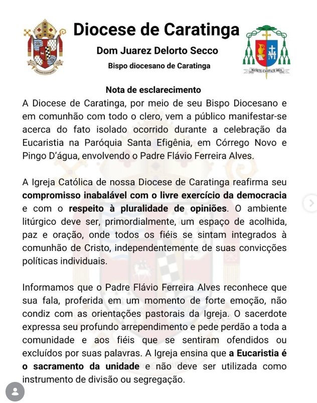 A Diocese assume o compromisso de tomar as devidas providências necessárias para que episódios desta natureza não voltem a ocorrer, preservando a sacralidade da missa. Reiteramos nossa responsabilidade com o diálogo aberto na comunidade para restaurar o clima de fraternidade e respeito mútuo”, disse Dom Juarez Delorto Secco, bispo diocesano de Caratinga.