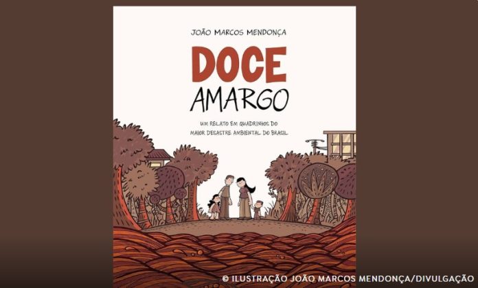 BH – A tragédia em Mariana (MG), que completa 10 anos neste dia 5 de novembro, arrasou famílias, destruiu cidades, poluiu rios e a lama tóxica deixou um rastro de destruição por onde passou. Uma das cidades mineiras atingidas por parte dos dejetos que saíram da barragem que se rompeu foi Governador Valadares, no Vale do Rio Doce. Este é o lugar onde vive o quadrinista João Marcos Mendonça, que acaba de lançar o álbum Doce Amargo, pela editora Nemo. A HQ, com roteiro e arte de João, mostra em 186 páginas o que sua cidade viveu há uma década.