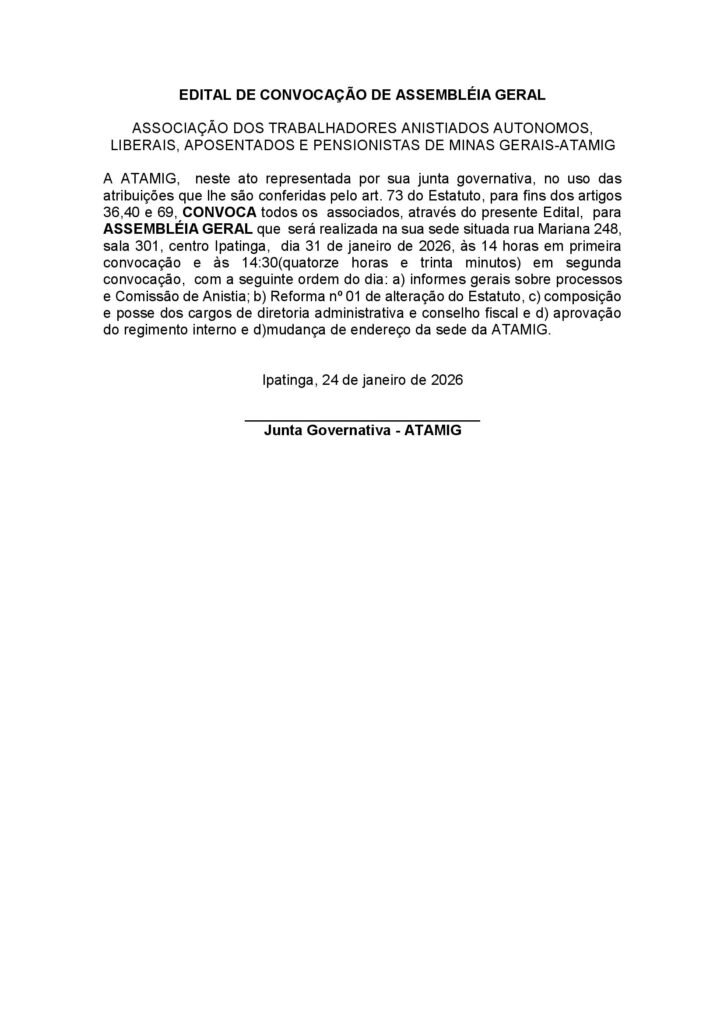 A Diretoria da subsede de Ipatinga do Sindicato Único dos Trabalhadores em Educação de Minas Gerais, entidade sindical de primeiro grau, inscrita no CNPJ sob o n. 65.139.743/0030-27, com subsede localizada a Rua Teresópolis n. 235, bairro Veneza, Ipatinga – MG, CEP: 35164-259, democraticamente eleita no último pleito para o mandato 2019/2022 e prorrogado até 15/05/2023, em atenção ao disposto no artigo 69 do Estatuto Social da entidade, convoca os Trabalhadores em Educação, filiados ao Sind-UTE/MG, para participarem de Assembleia Geral de Filiados, a ser realizada na subsede de Ipatinga, localizada na rua Teresópolis número 235, bairro Veneza, Ipatinga – MG, CEP: 35164-259, no dia 08 de março de 2023, às 18h, em primeira convocação e às 18h30, em segunda convocação, para discutir e deliberar sobre a seguinte ordem do dia: Instaurar o processo eleitoral e eleger a Comissão Eleitoral Local da subsede de Ipatinga que organizará as eleições para o mandato 2023/2027, da Diretoria Estadual e das Diretorias das Subsedes do Sindicato Único dos Trabalhadores em Educação de Minas Gerais, bem como dos membros do Conselho Geral, a se realizar entre os dias 24/04/2023 e 28/04/2023.