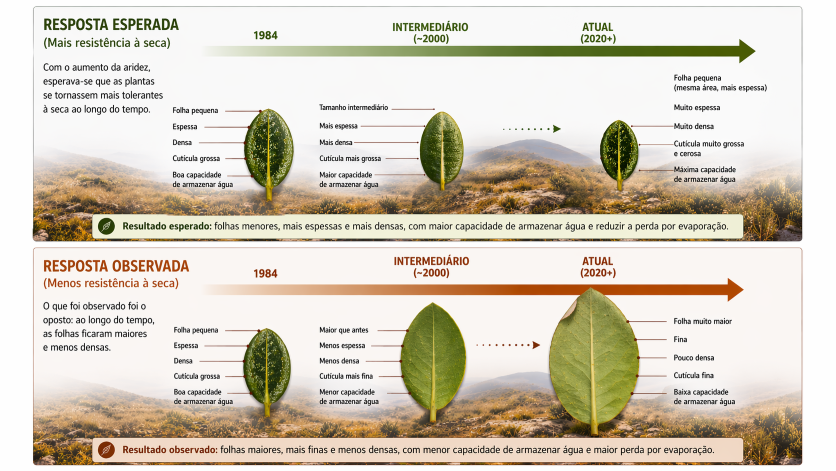 Diante de um cenário de maior aridez, a expectativa era de que as comunidades vegetais se tornassem mais adaptadas à economia de recursos, com folhas menores e mais densas. No entanto, os resultados mostraram o oposto: um leve, mas contínuo, relaxamento na capacidade de responder às mudanças drásticas no clima, ou seja, um relaxamento funcional. Em média, as folhas ficaram maiores e menos densas ao longo do tempo, contrariando as projeções iniciais sobre como esse sistema responderia ao estresse climático.