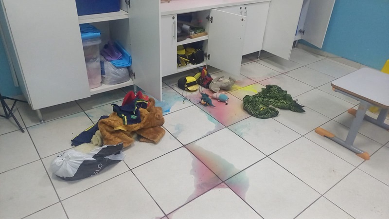Durante a varredura nas dependências, foi constatado que a brinquedoteca havia sido um dos principais alvos da invasão. No local, o homem tentou subtrair uma mesa infantil, revirou tintas usadas em atividades pedagógicas, mexeu em fantasias infantis e separou duas lâmpadas que estavam guardadas em um canto da sala.