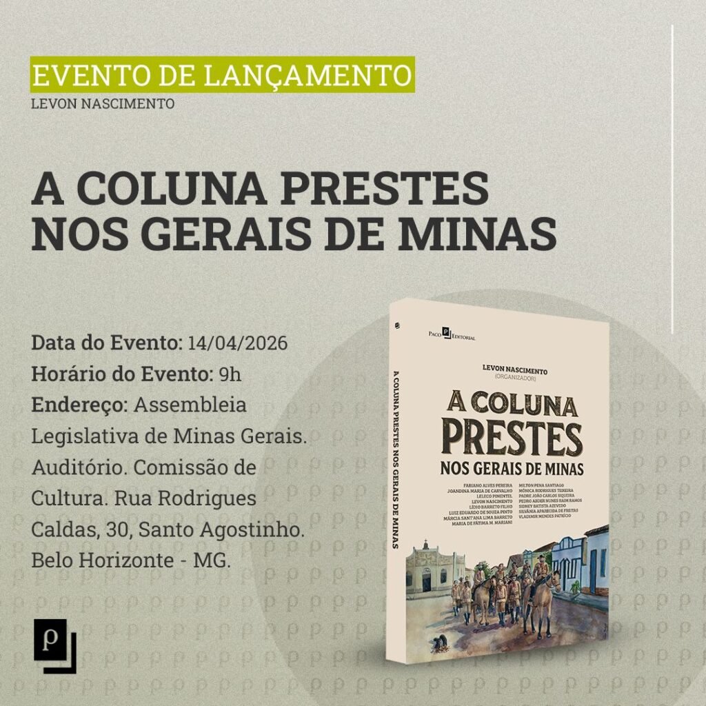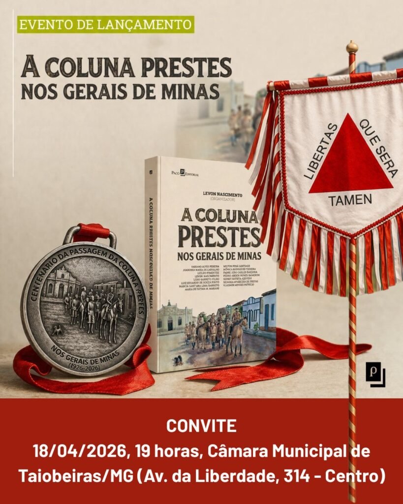 TAIOBEIRAS – A cidade de Taiobeiras (MG) será palco, na noite de sábado, 18 de abril de 2026, às 19 horas, na Câmara Municipal, de um dos mais relevantes eventos culturais e históricos da região: o lançamento do livro A Coluna Prestes nos Gerais de Minas, organizado pelo professor e pesquisador Levon Nascimento.