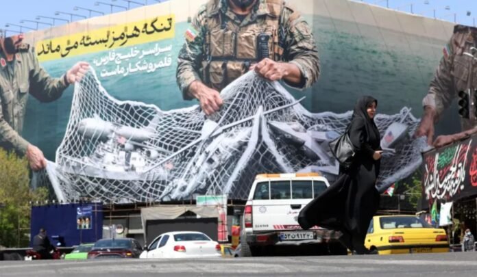 FOTO: Trânsito passa por um outdoor com os dizeres: “O Estreito de Ormuz permanecerá fechado”, na Praça Enghelb, em Teerã